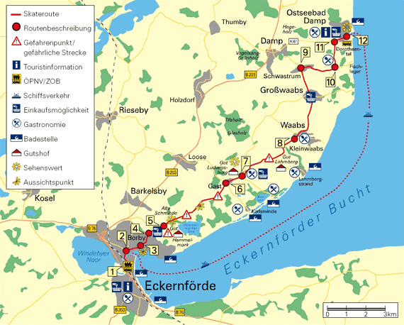 Von Eckernförde nach Damp Start: ZOB Eckernförde Diese landschaftlich sehr schöne Strecke ist für erfahrene Skater mit guter Kondition geeignet. Der kurvenreiche Weg mit leichten Steigungen und sanften Gefällen verläuft in weiten Teilen auf dem Ostseeküstenradweg. Mit entsprechendem Radverkehr ist daher zu rechnen. Für der Rückweg bietet sich der Bus und in der Saison auch eine Schiffstour an. |