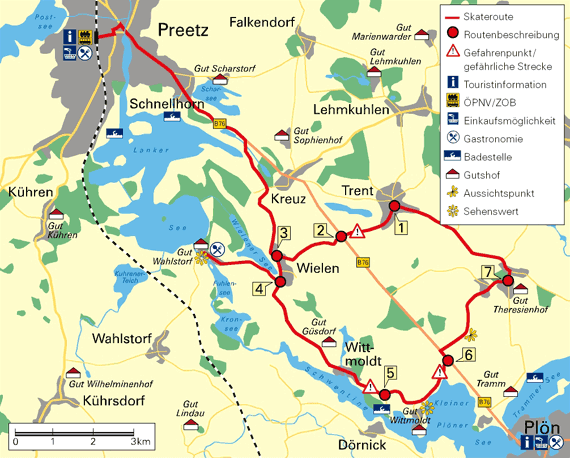 Zwischen Preetz und Plön – Höhen und Seen Start: Trent, Parkplatz 100 m hinter dem Ortseingang links vor dem Backsteinhaus des Umspannwerkes. Alternativ: Vom Bahnhof Preetz starten und die Tour bei Punkt 3 beginnen. Eine sehr schöne Strecke durch Felder und Knicks, vorbei an Gutshöfen und lieblichen Dörfern, am Wielener See, Lanker See, Kleinen Plöner See und an der Schwentine mit herrlichen Ausblicken. Gut geeignet für bremstechnisch erfahrene Skater mit guter Kondition.