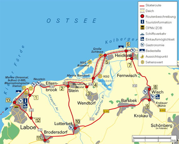 Von Laboe über Stein nach Barsbek und Lutterbek Start: Laboe, Parkplatz oberhalb des Marine-Ehrenmals Eine landschaftlich schöne Strecke, überwiegend auf gut asphaltierten Rad- und Fußwegen mit sehr guter Anbindung an Kiel. Auf und hinter dem Deich, vorbei an Naturschutzgebieten und durch Salzwiesen ist dies eine abwechslungsreiche Tour. Im Sommer bieten sich durch die Fördeschifffahrt viele alternative Strecken- und Kombinationsmöglichkeiten.
